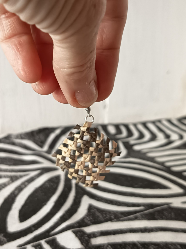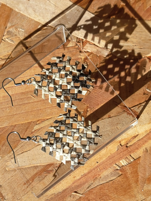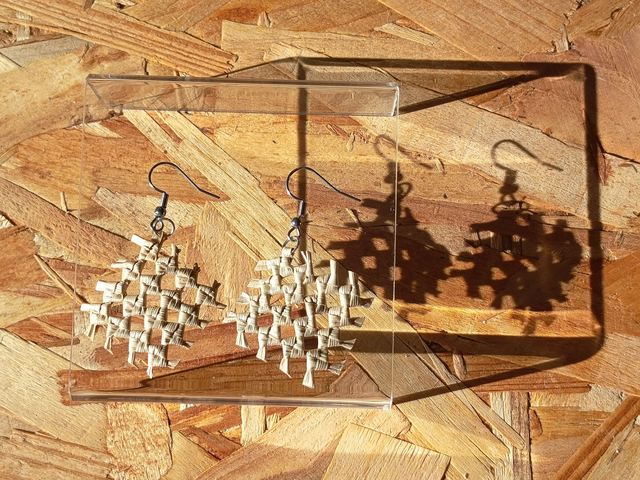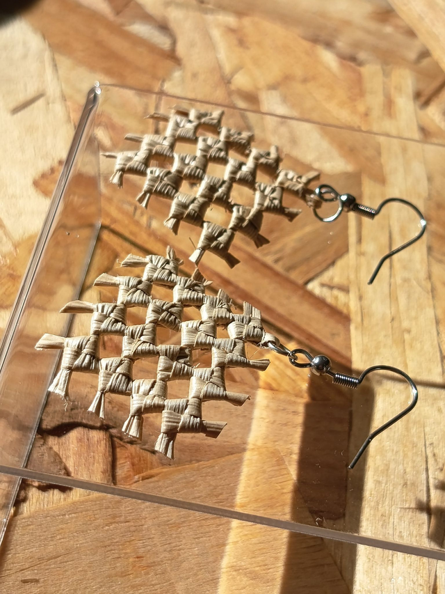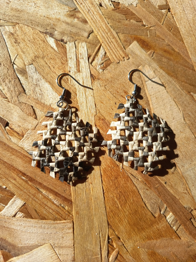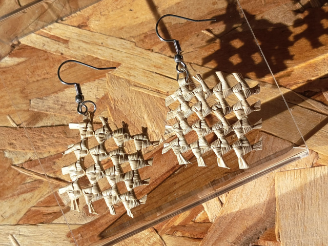 Boucles d’oreilles légères et naturelles, tressées à la main en pandanus vert et blanc.